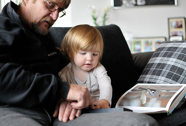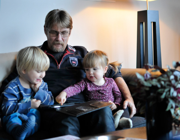 Tova och kusinen lägger pussel på iPaden med morfar.