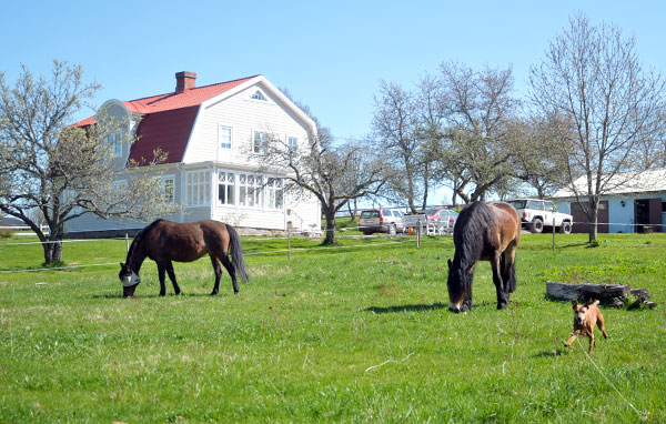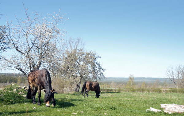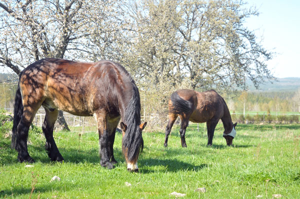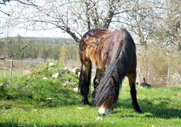 De senaste dagarna när gräset börjat titta upp på riktigt har hästarna fått gå i trädgården tidvis, för att få smaka lite grönt. Sparar på betena så långt det går, och i trädgården finns det gräs… Har klippt det idag, för första gången i år.