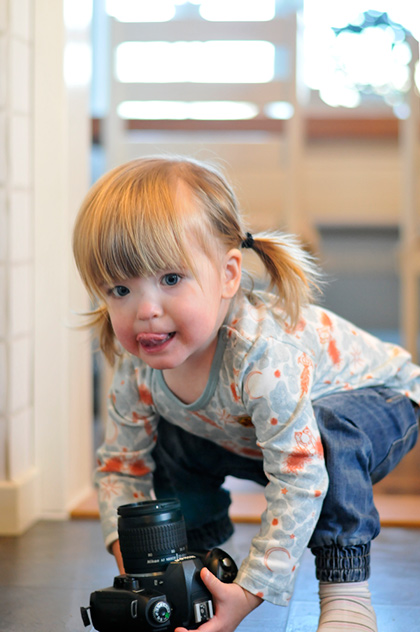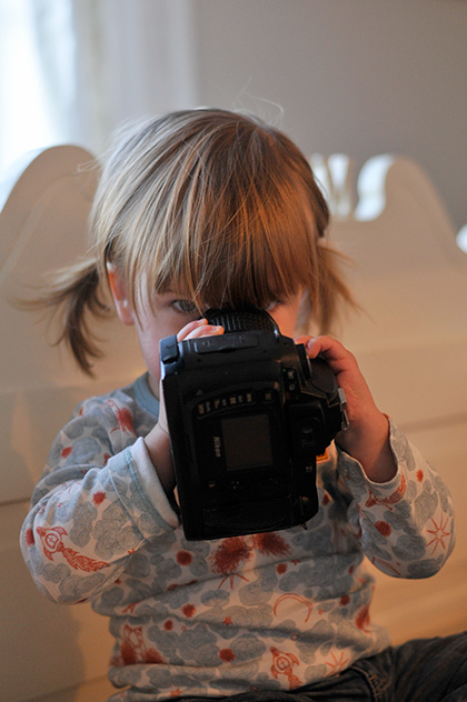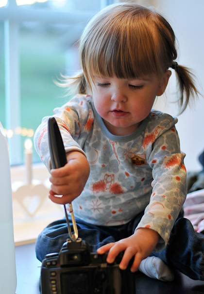 Tova sträcker sig ofta efter min kamera, och vill testa, känna, prova, göra. Den är tung och otymplig, och än har jag inte köpt någon annan så den borde få leva ett tag till, så jag letade fram en gammal D70 i gömmorna. Med ett lätt (uselt..) kitobjektiv på väger den inte så mycket, och är kanske lagom för en tjej på 20 månader? Det är ingen proffskamera, men nånstans ska man ju börja.