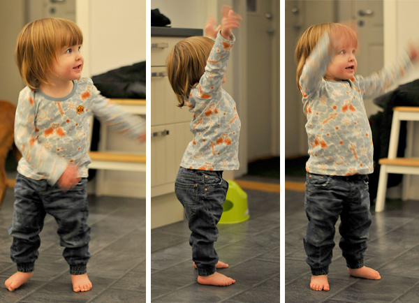Och förutom förmågan att skruva på grejer med köksredskap är Tova mammas tjej på dans(köks)golvet också. Idag kom vi in efter en promenad och Iron Maiden strömmar ut högtalarna. Tova börjar dansa och fäkta med armarna innan hon ens kommit ur overallen 🙂 Stilstudien nedan är dock rörelserna till Imse vimse spindel.